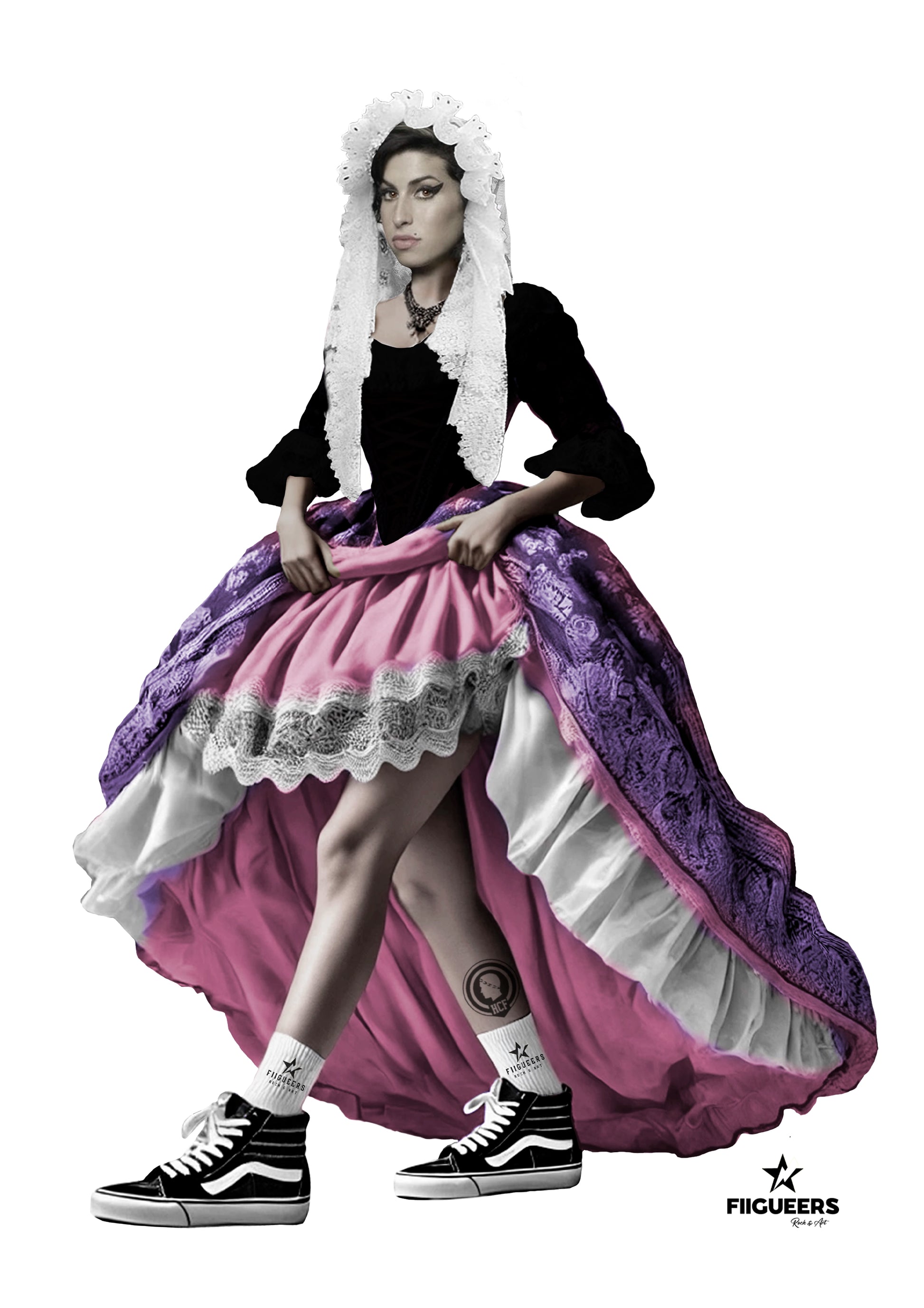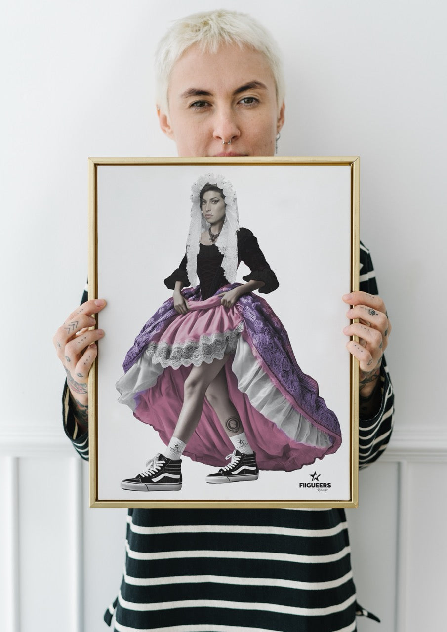 "AMY DEL FUEGO” es un print de collage pop urbano Fiigueers, donde Amy Winehouse aparece vestida con el traje tradicional de La Dama del Fuego, un icono de la cultura alicantina. Bajo la falda levanta actitud: Vans clásicas, rebeldía pura y un tatuaje del escudo del Hércules CF en la pierna, como guiño orgulloso a Alicante. Una mezcla perfecta de tradición, música y calle.